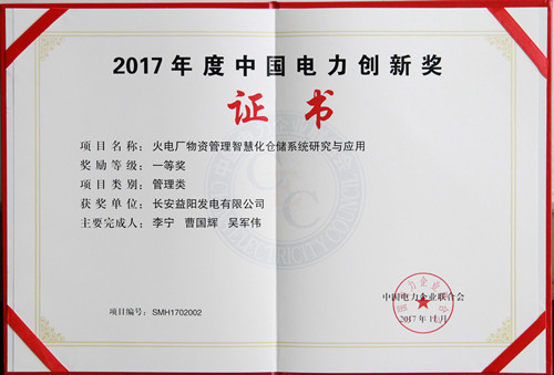 長安益陽公司《火電廠物資管理智慧化倉儲系統研究與應用》項目榮獲2017年度中國電力創新獎一等獎