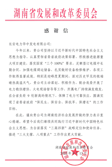 感謝信中說,今年以來,華中公司堅持以習近平新時代中國特色社會主義思想為指導,認真貫徹省委省政府決策部署,積極推進能源重大項目建設,落實國家“三個100%”要求,足額簽訂電煤中長期合同,加強電煤調運儲備,扎實做好設備維護,各項工作取得顯著成效。特別是迎峰度夏期間,面對歷史罕見的極端晴熱高溫天氣,公司主動謀劃、積極作為,配合發改委開展了電力穩供增供、火電現場督導等工作,所屬電廠持續滿發穩發,在全省負荷9創新高的情況下,保障了電力可靠供應,圓滿實現了省委省政府“保民生、保安全、保增長”的工作目標。